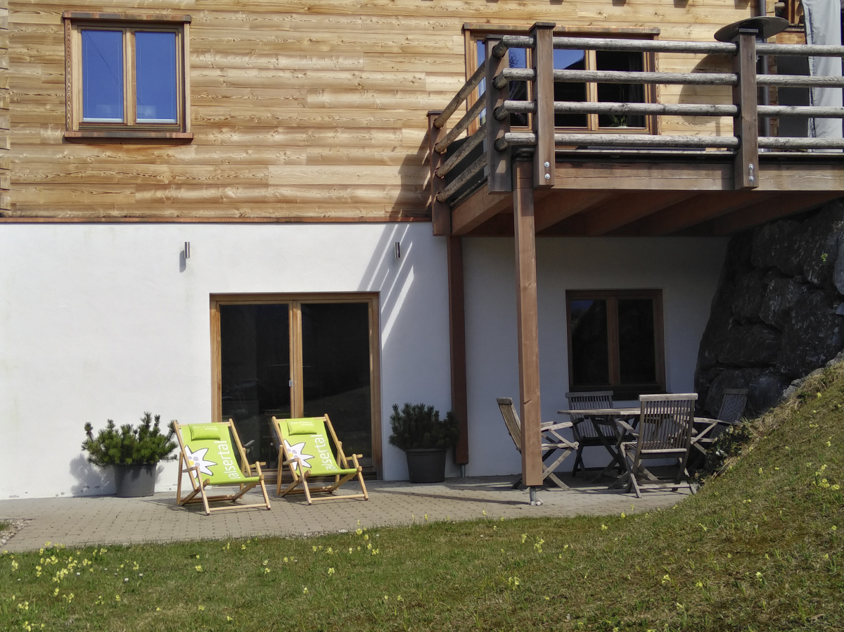Nach einem Tag in den Bergen lädt Sie die großzügige Terrasse zum Verweilen oder Relaxen im Liegestuhl ein.